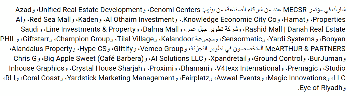 وعقب نجاح الفعالية، قال ديفيد ماكادام، الرئيس التنفيذي لمجلس الشرق الأوسط لمراكز التسوق وتجارة التجزئة : “قدم مؤتمر التجزئة لمنطقة الشرق الأوسط وشمال أفريقيا 5202 قيمة ملموسة في جميع جوانب برنامجنا. إن الحضور القياسي، إلى جانب الشراكات الجوهرية التي تم إبرامها على أرض الحدث ومستوى النقاشات الاستراتيجية طوال جلساتنا، يؤكد على المؤتمر كمنصة أساسية لتحول قطاع التجزئة في المنطقة. غادر مشاركونا وهم مزودون برؤى قابلة للتنفيذ، وعلاقات تجارية جديدة، وقناعة متجددة بمسار القطاع.”
